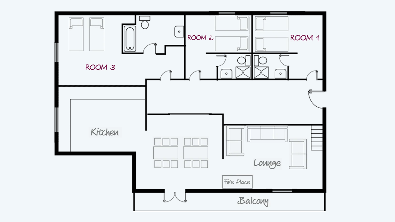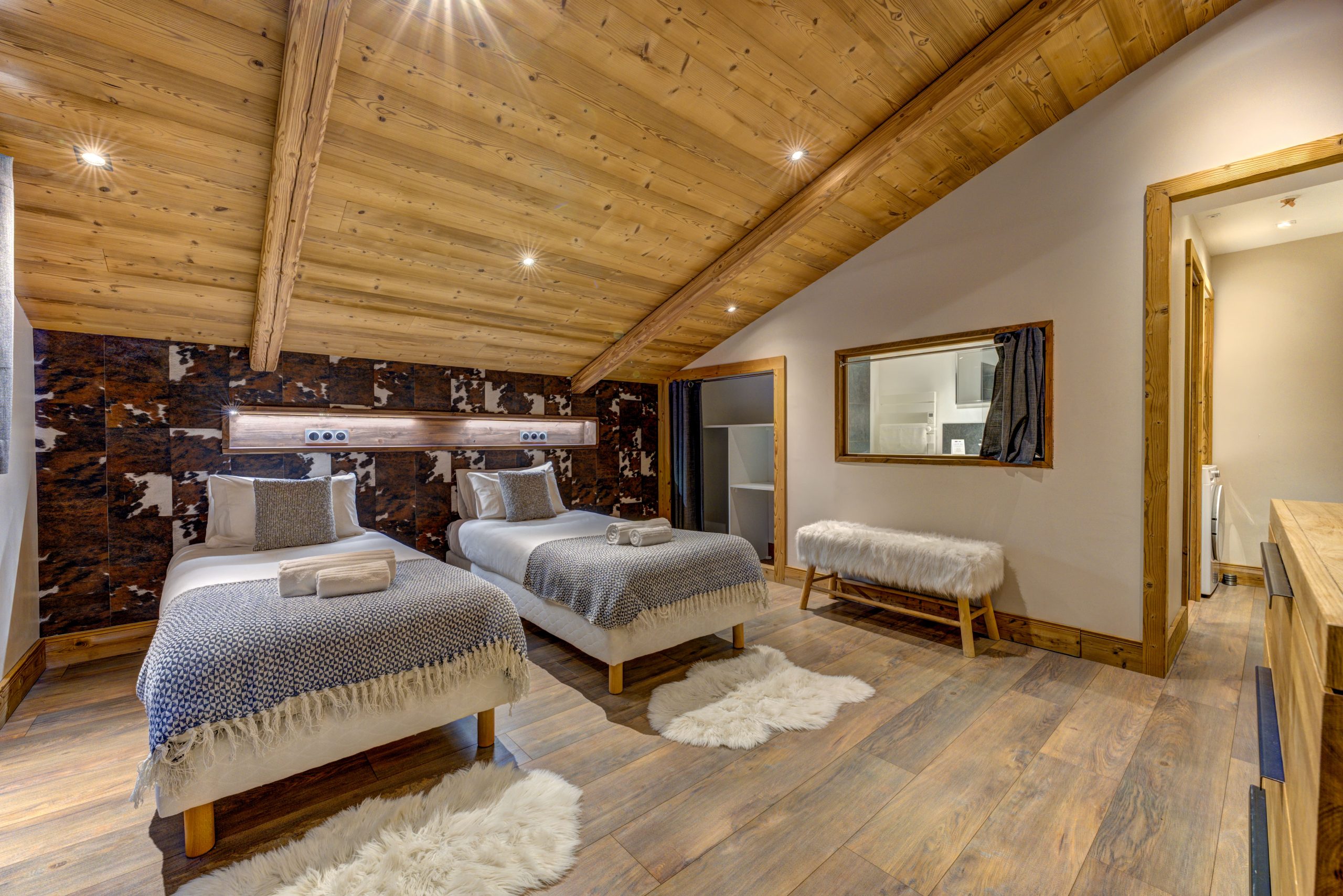 Sleeping 12 guests, there are 3 twin bedrooms on the top floor, and 3 twin bedrooms on the lower floor, all of which are ensuite. The lower floor also offers a large open plan living are with a log burning stove and a large south facing balcony.